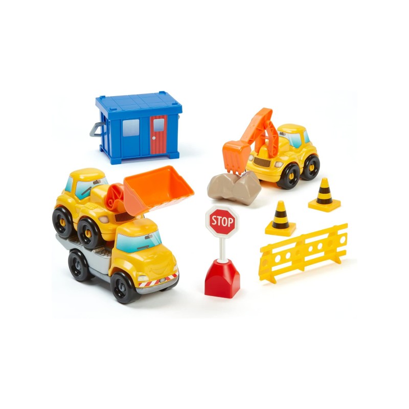 Setul include un camion mare cu încărcătură, un camion cu remorcă capabil să transporte excavatorul, un încărcător cu lopată, un camion basculant și o macara mare.