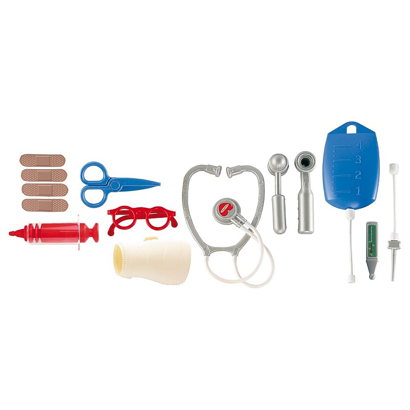 Realizat din materiale rezistente și netoxice, acest set include toate accesoriile medicale pentru manechine, cum ar fi stetoscop, foarfecă, bandaj, seringă, termometru, pungă cu soluție salină, cutie medicală și multe altele.