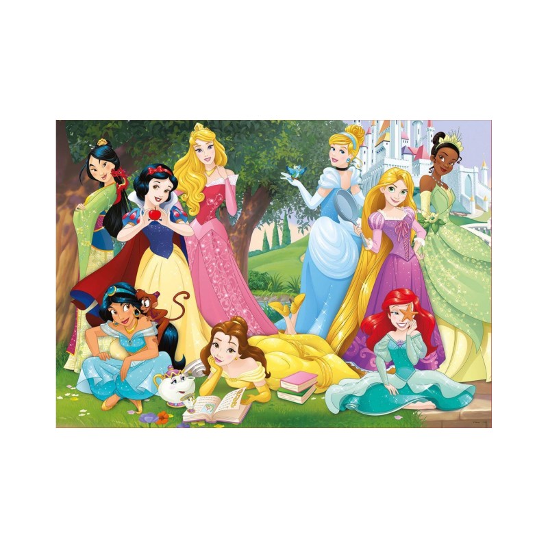 Frumoasele prințese Disney indragite de cei mici se distrează în grădină. În fundal, se poate observa castelul in care acestea se retrag la finalul zilei.