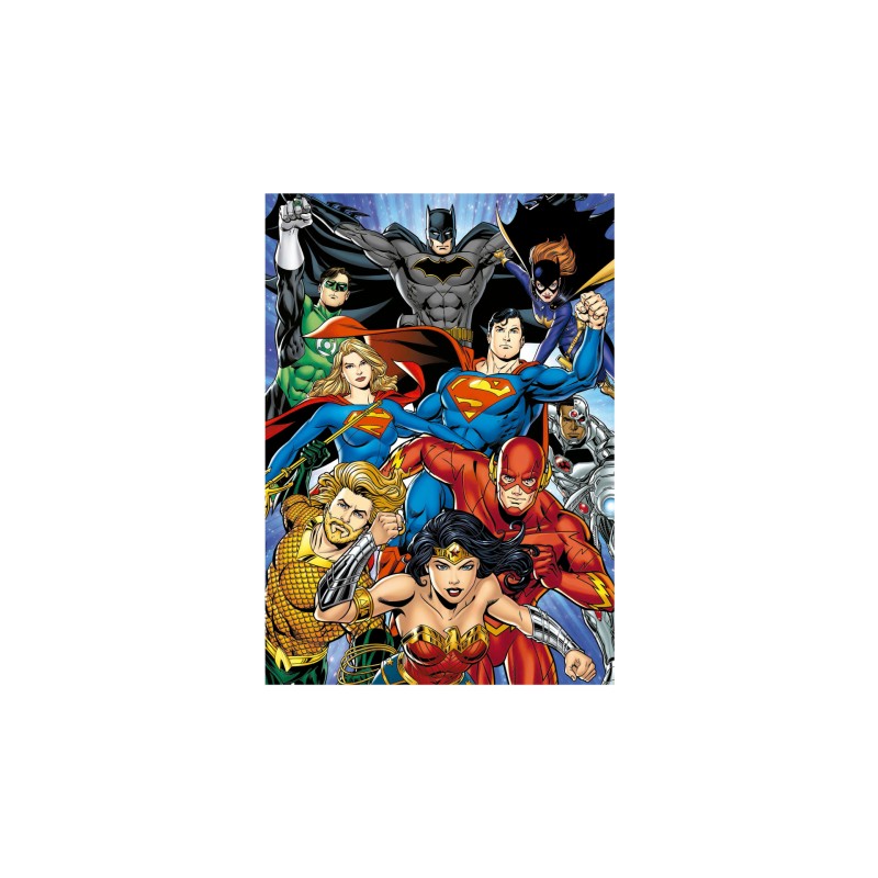 Acest puzzle oferă o imagine vibrantă în care apar personaje iconice precum Superman, Batman, Wonder Woman, Flash și Aquaman, creând o scenă dinamică plină de acțiune pentru fanii benzilor desenate.