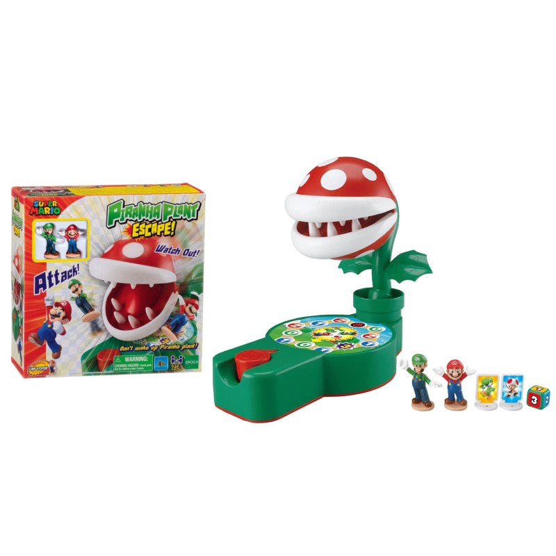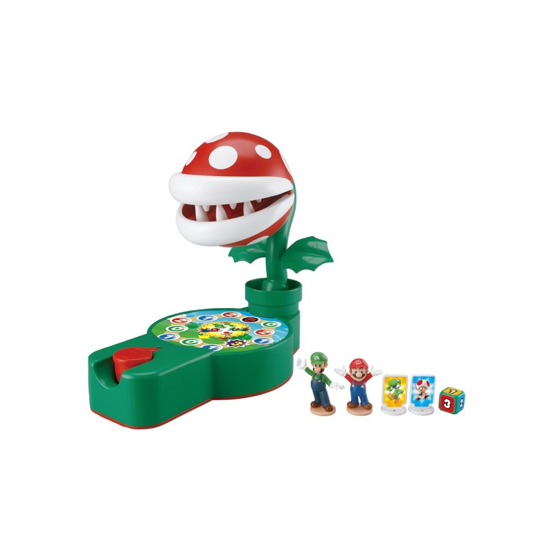 Jocul include o bază Piranha Plant ușor de asamblat cu tablă de joc, 2 figurine unice Super Mario, inclusiv Super Mario și Luigi, 2 plăci cu personaje cu autocolante Yoshi și Toad și un zar de joc.