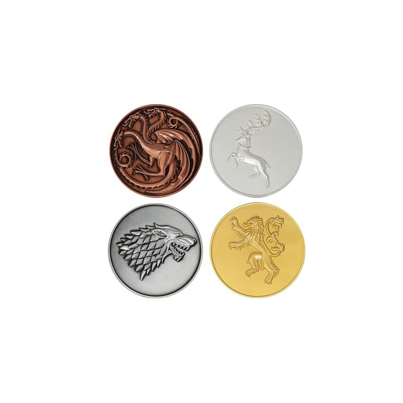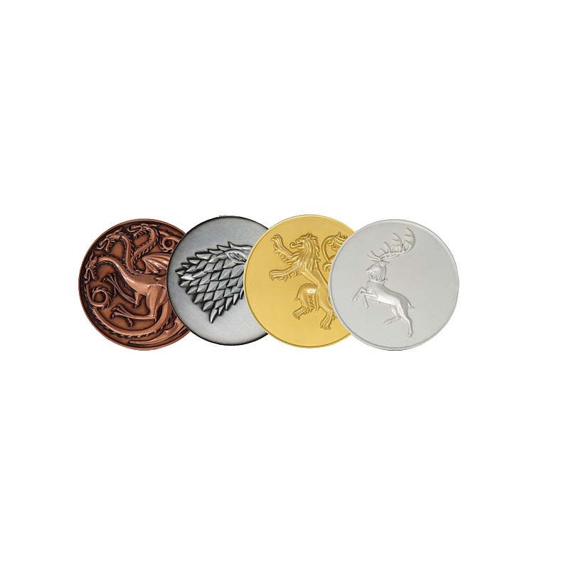 Acest set de 4 medalioane din metal prețios, puternic reliefate, conține însemnele a 4 dintre cele mai emblematice case din Game of Thrones: Casa Baratheon, Casa Targaryen, Casa Lannister și Casa Stark.