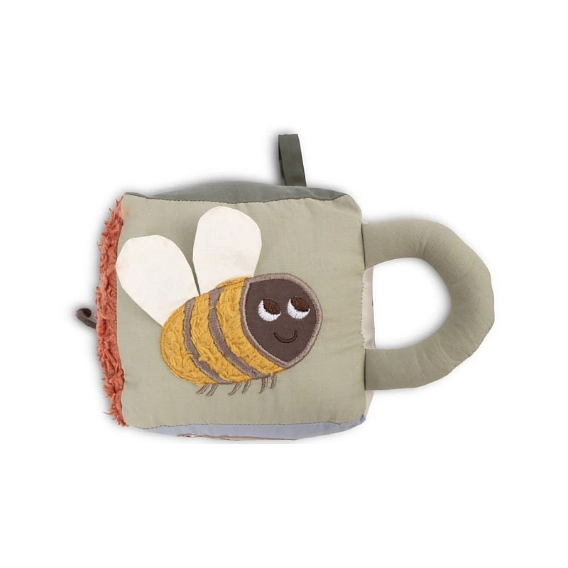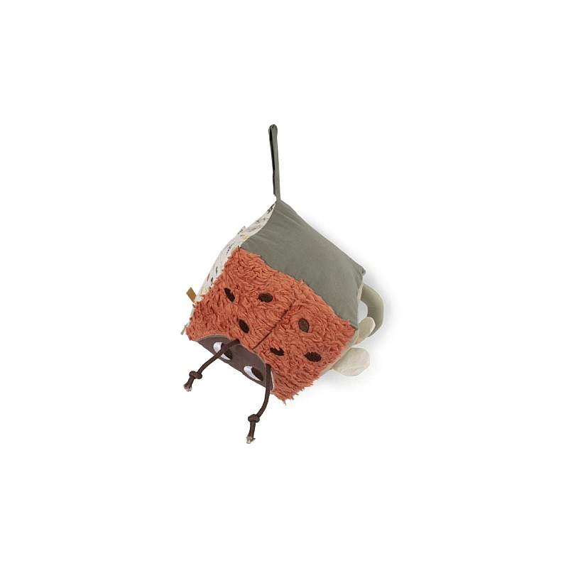 Cubul moale este proiectat în tonuri verzi și pământii, cu elemente diferite pe fiecare parte pentru ca bebelușul dvs. să le exploreze.