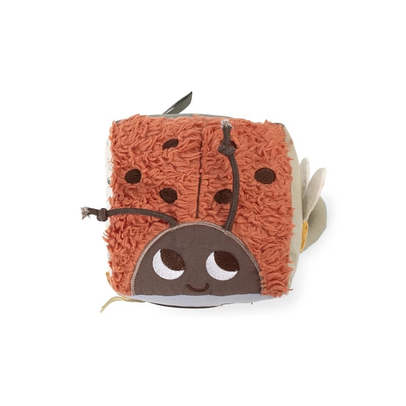 Cubul este plin de detalii stimulante, inclusiv oglindă, clopoțel, ilustrații, sunet de pocnitură, sfori și țesături, astfel încât există o mulțime de lucruri pe care mânuțele mici le pot explora.