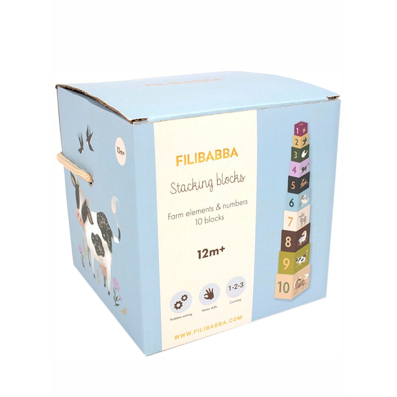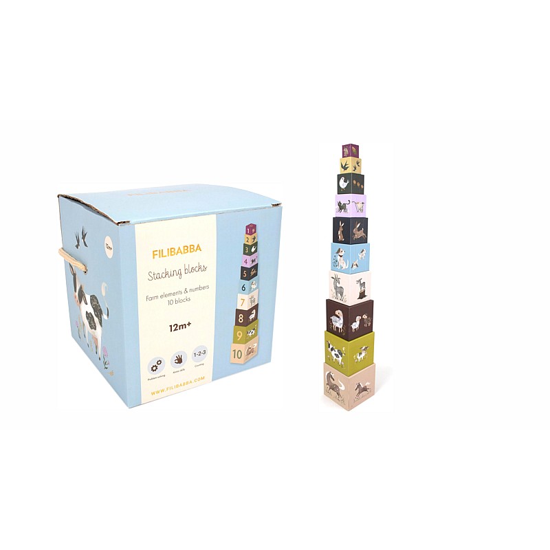 Cuburile de stivuit Filibaba Magic Farm îl ajută pe copilul dumneavoastră să numere până la zece, în timp ce descoperă lumea animalelor de la fermă.