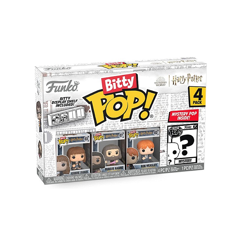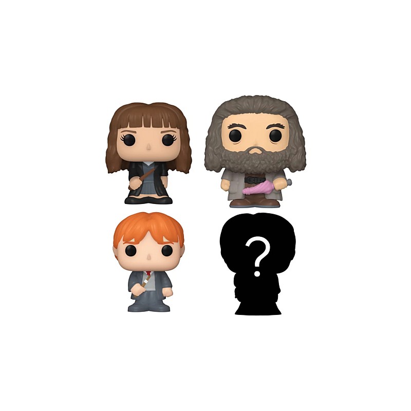Colecția Hermione Funko Bitty Pop! Mini-Figure 4-Pack include 1 x Hermione Granger, 1 x Ron Weasley, 1 x Rubeus Hagrid Bitty Pop!, iar una va fi o figurină de urmărire surpriză!