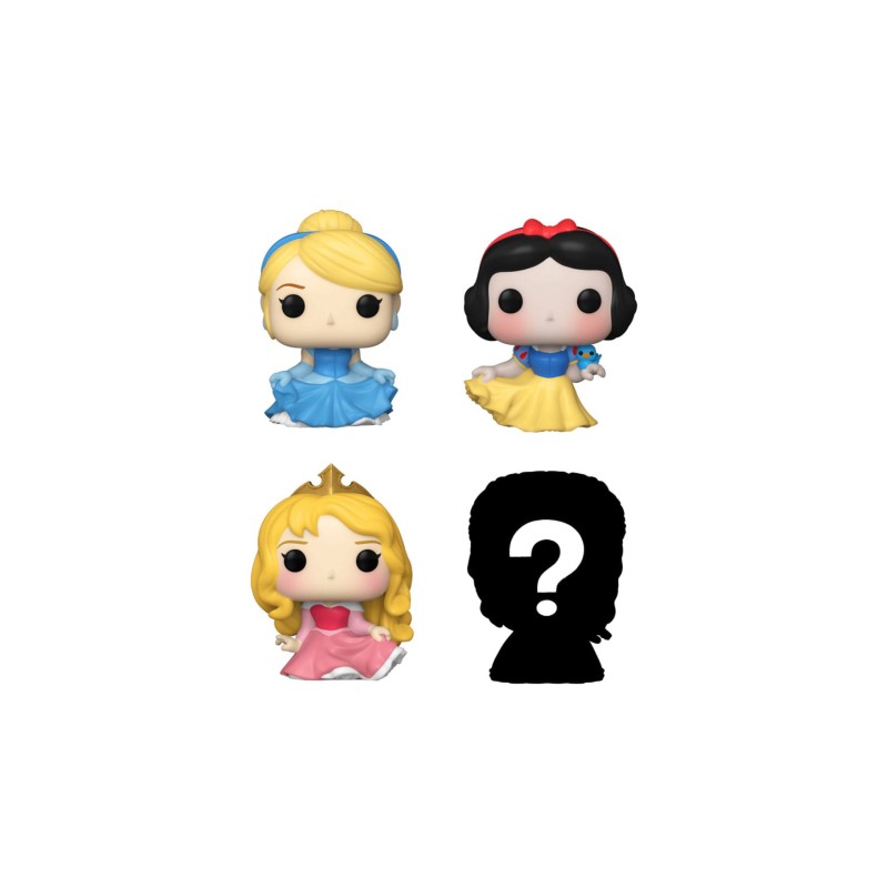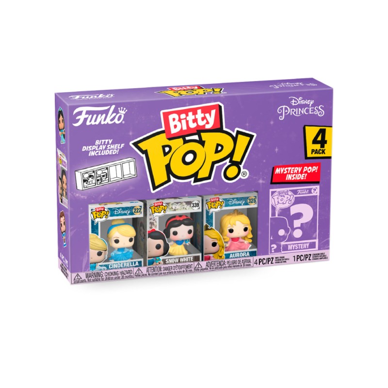 Acest pachet de 4 include figurine Bitty Pop! Cenușăreasa, Albă ca Zăpada, Aurora și o figurină Bitty Pop! misterioasă.