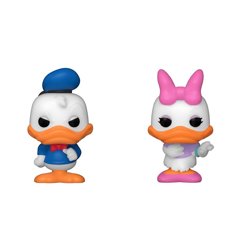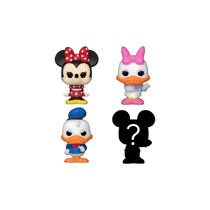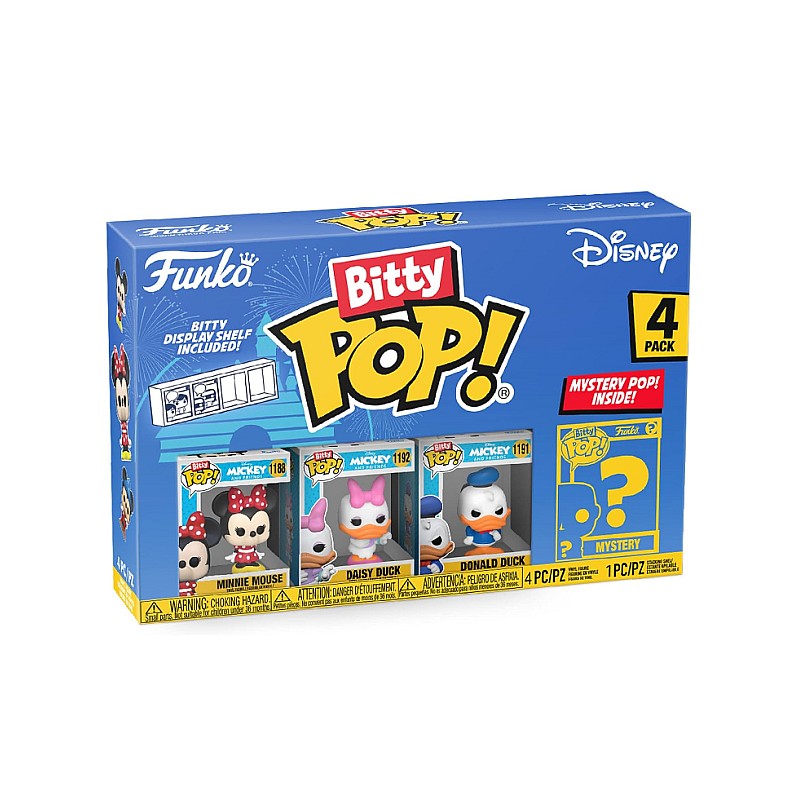 Acest pachet de 4 figurine include figurine Bitty Pop! Minnie Mouse (rochie roșie), Bitty Pop! Daisy Duck, Bitty Pop! Donald Duck, și o figurină Bitty Pop! misterioasă.