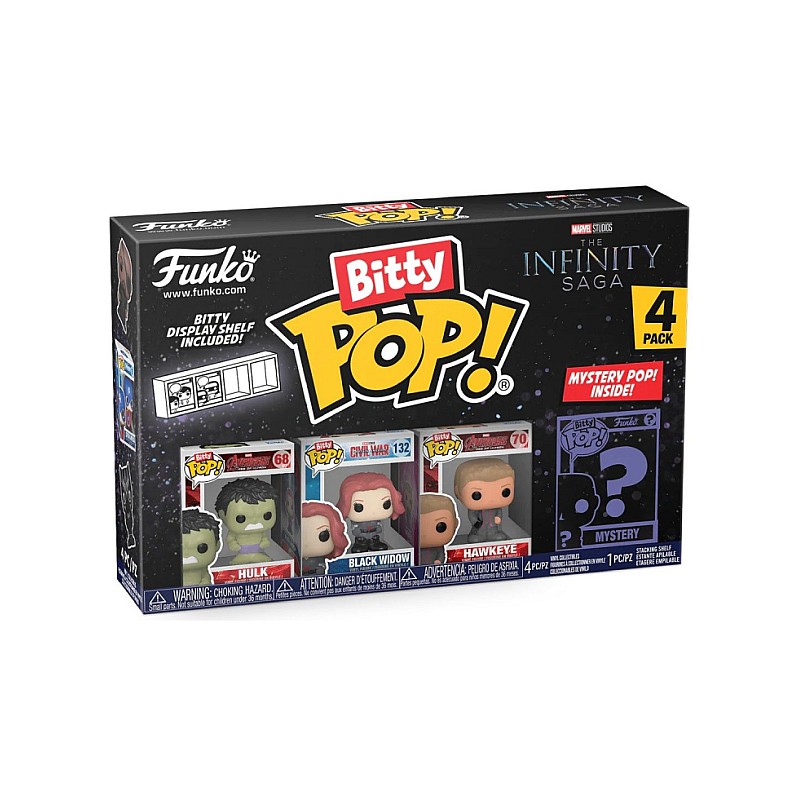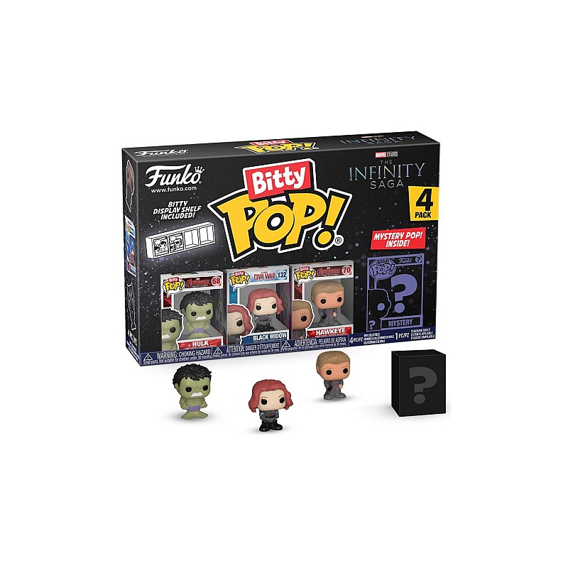 Acest pachet de 4 include figurine Bitty Pop! Hulk, Bitty Pop! Black Widow, Bitty Pop! Hawkeye și o figurină misterioasă Bitty Pop.