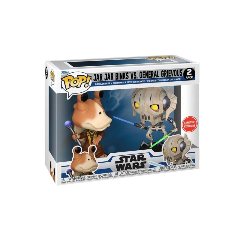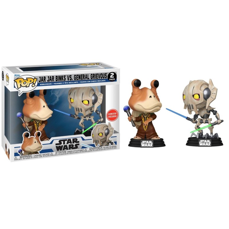 Acest set de 2 figurine exclusiv cuprinde Pop! Jar Jar Binks vs. Pop! General Grievous în timp ce se luptă cu booma și sabiile ridicate.