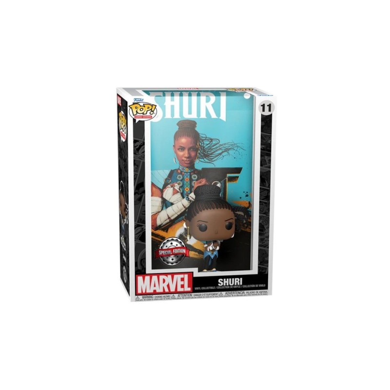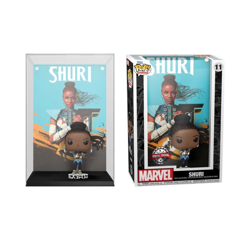 Această piesă de colecție specială prezintă coperta nr. 1, 2018, a benzii desenate Marvel și un Pop! al lui Shuri, toate preambalate într-o cutie de protecție care poate fi atârnată pe perete.