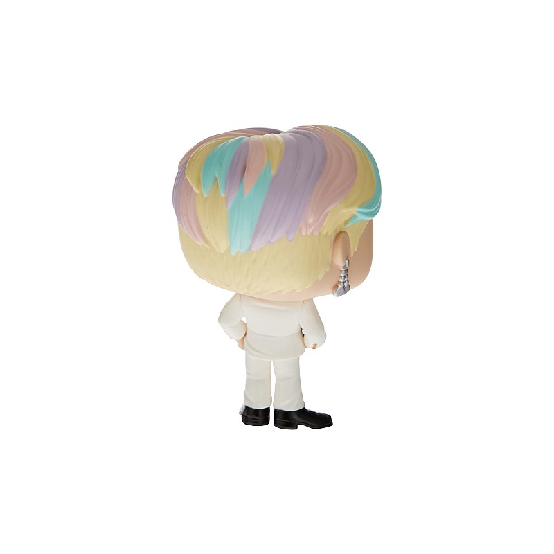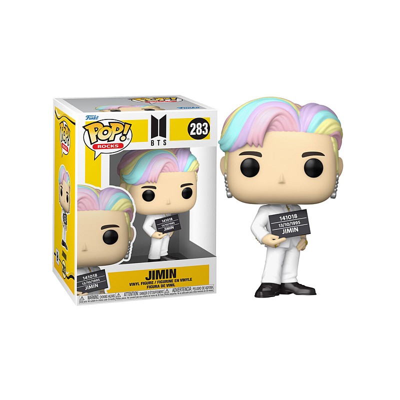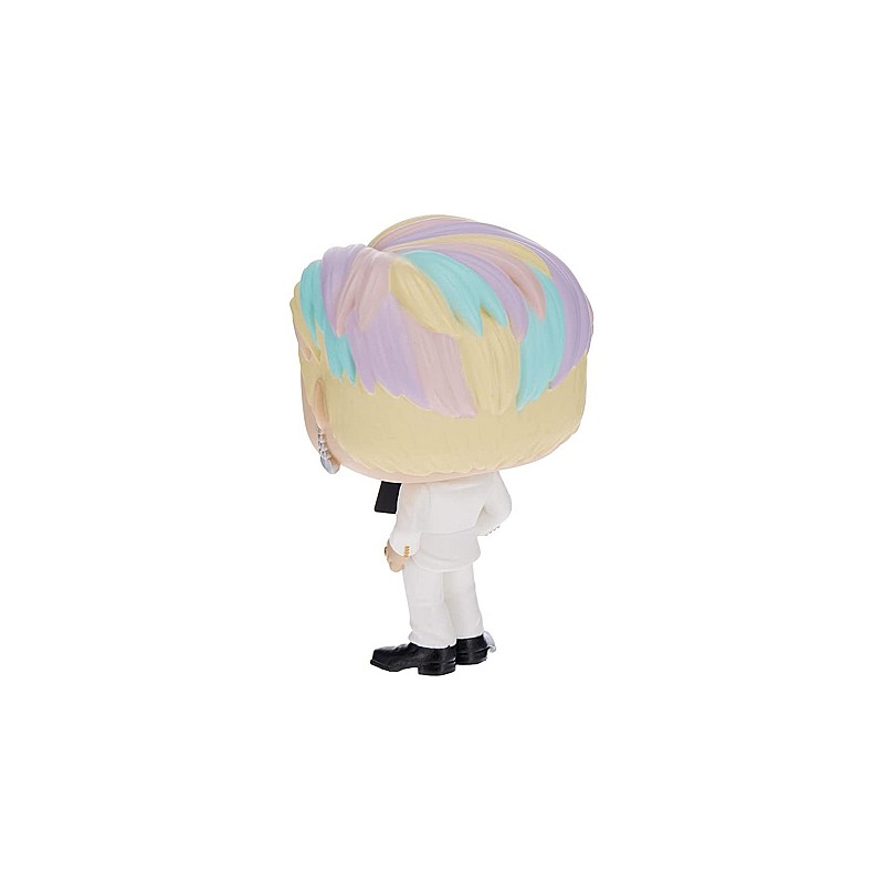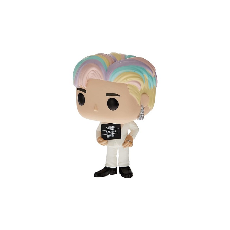 Acest Pop! il prezinta pe Jimin din BTS, imbracat elegant, care tine un semn cu numele sau in mana.