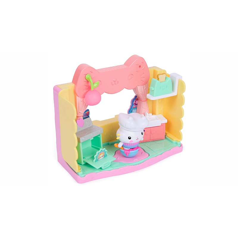 Gabby Movie Magic: Cakey's Sprinkle Cake-tastic Kitchen este un set de joacă Gabby's Dollhouse format din 10 piese, care include 8 accesorii și o figurină Cakey, pentru a inspira jocul de rol și creativitatea.