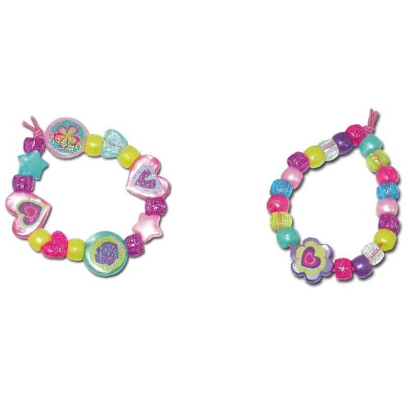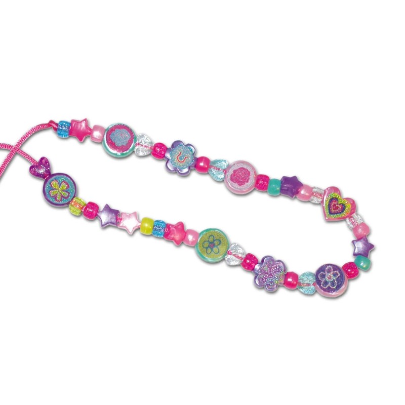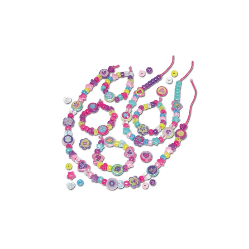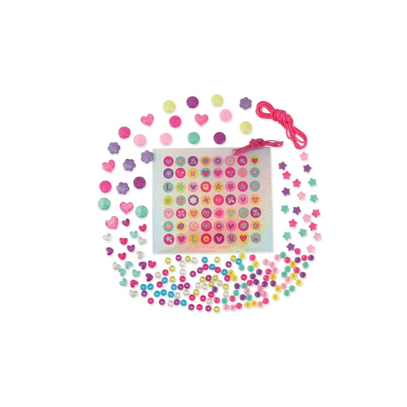 Adăugați mărgele la elastic pentru a face brățări amuzante. Include 25 de mărgele cu imagini (rotunde, inimă și floare), autocolante holografice, 20 de mărgele inimă, 20 de mărgele stea, 120 de mărgele rotunde, cordon mătăsos, elastic și ghid.