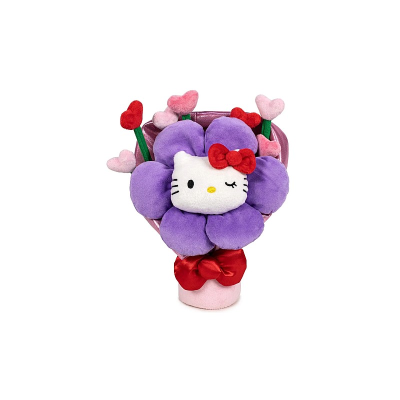 Acest buchet de pluș de 28 cm înălțime o include pe Hello Kitty în centru, iar în jurul ei flori de pluș înfășurate într-un buchet.