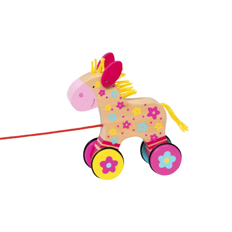 Cal de tracțiune colorat vesel care te urmează peste tot. Învață să mergi cu acest căluț drăguț cu floricele.