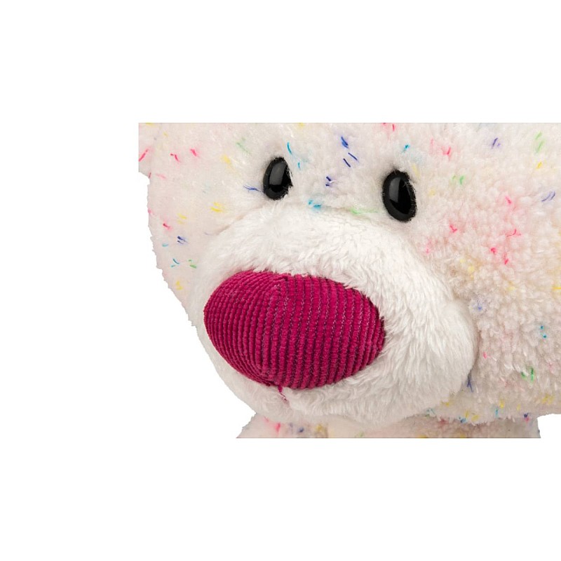 Acest ursuleț de pluș de culoare crem are un model colorat cu pete de curcubeu, un nas roz strălucitor și un corp zvelt, cu membre jucăușe.