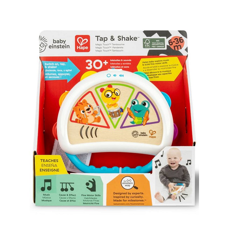 Tamburina Baby Einstein + Hape Tap & Shake Magic Touch este un instrument muzical portabil, ușor de prins, care dezvoltă descoperirea cauzei și efectului și abilitățile motorii fine.