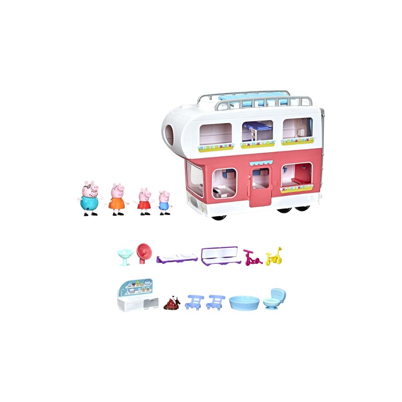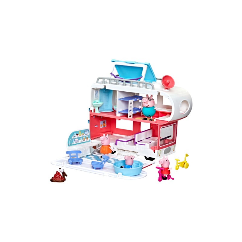 Cu setul de joacă Hasbro Peppa Pig - Camperul familiei Peppa, cu 4 purceluși , vă veți preface că sunteți pe drum cu Peppa și familia ei.