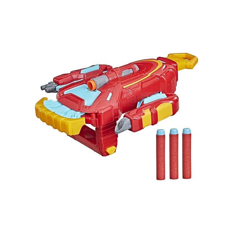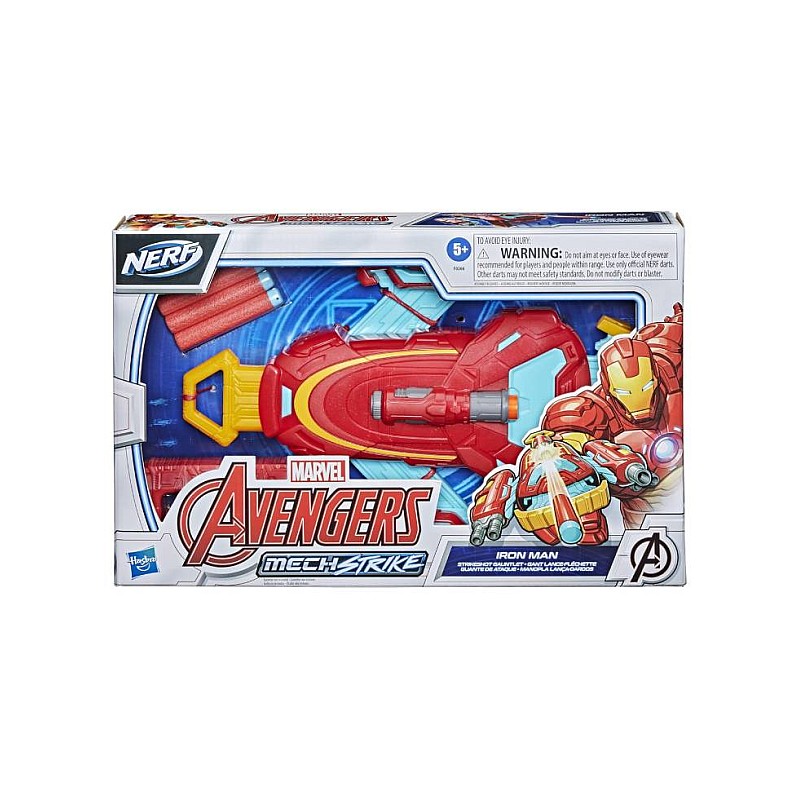 Mănușa Mech Strike a lui Iron Man se extinde prin tragerea unui mâner și aruncă proiectile NERF pentru a învinge răul.