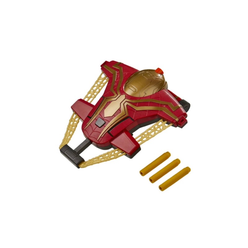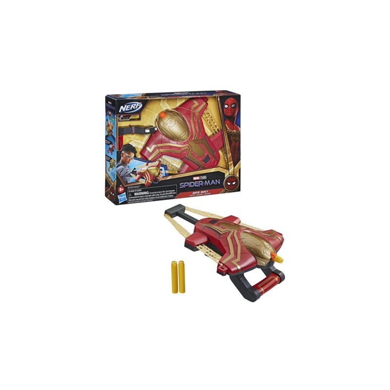 Blasterul Spider-Man Web Bolt Blaster are detalii cu pânze și un design roșu și auriu inspirat de costumul de integrare al lui Spider-Man.