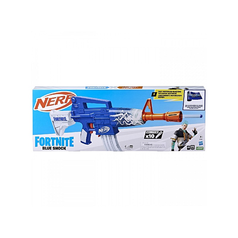 Blasterul Nerf Fortnite Blue Shock este inspirat de echipamentul folosit în Fortnite și vine în învelișul Blue Shock din jocul video.