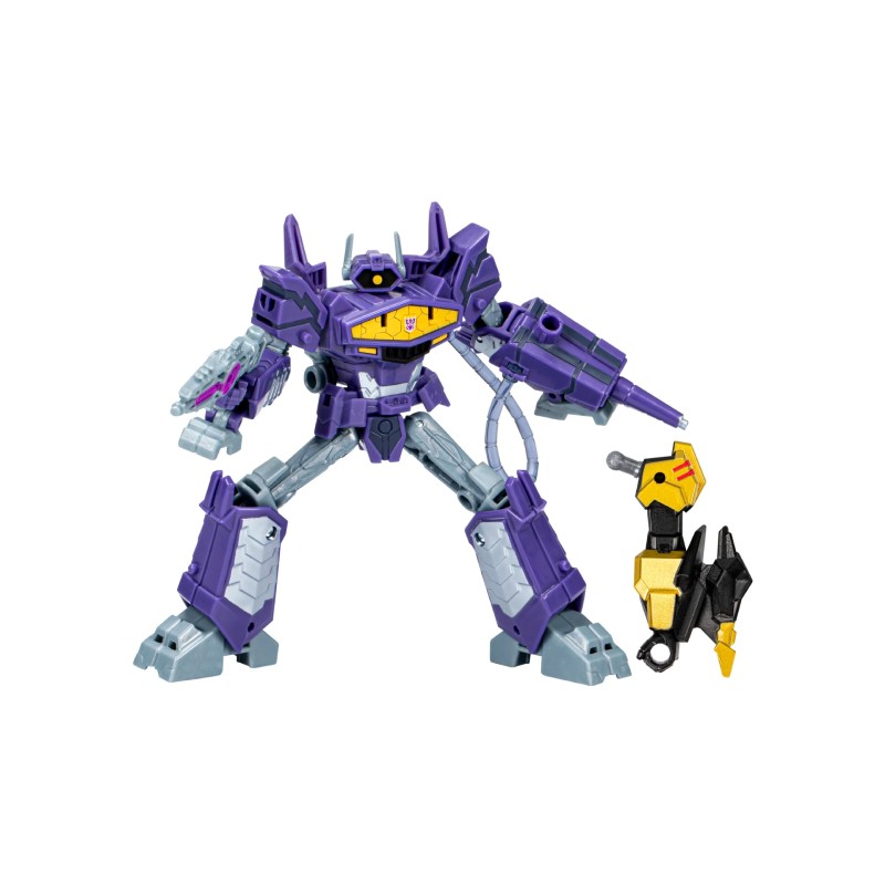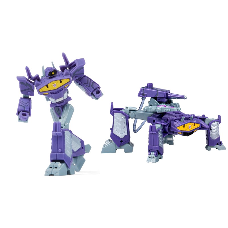 Figurinele Deluxe Class aduc roboții Transformers la viață de pe ecranul televizorului direct în casa ta. Jucăria clasică Shockwave mov și argintiu apare așa cum a fost văzută în Transformers: EarthSpark din seria animată de televiziune .