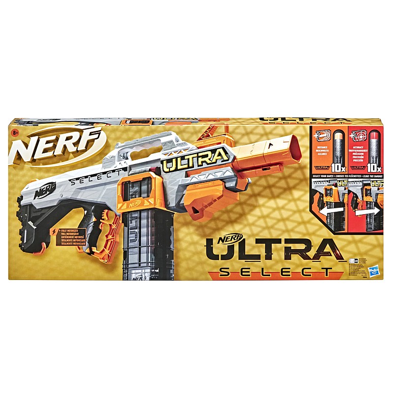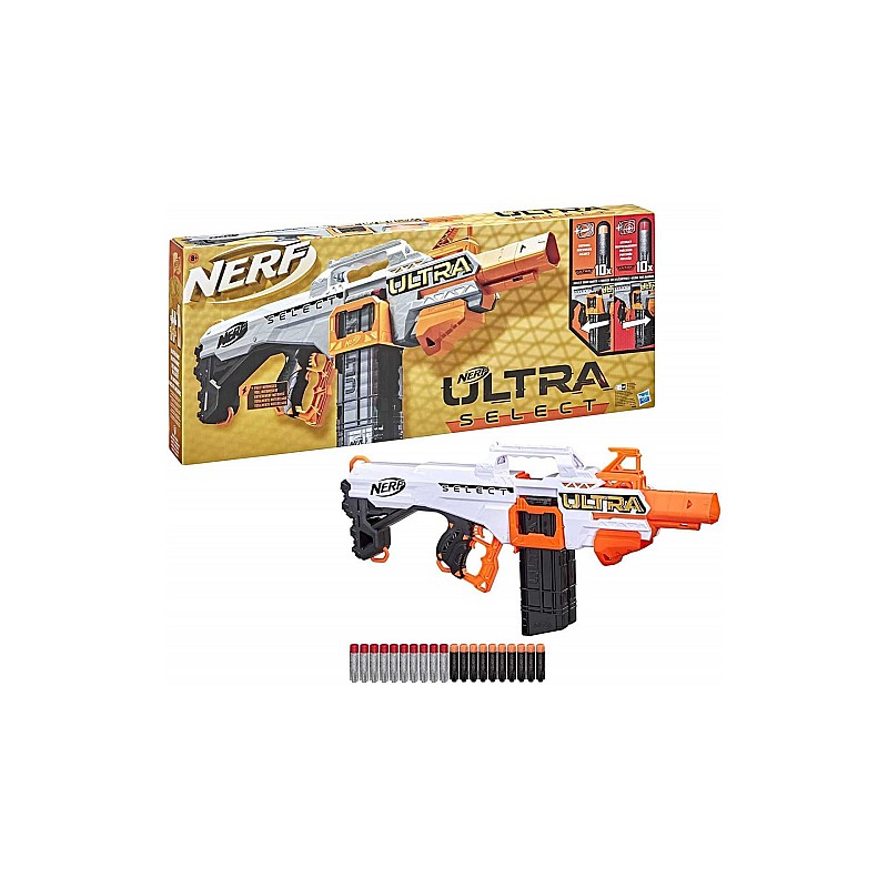 Blasterul Nerf Ultra Select are 2 încărcătoare și include 10 săgeți Nerf Ultra de distanță și 10 săgeți Nerf Ultra de precizie.