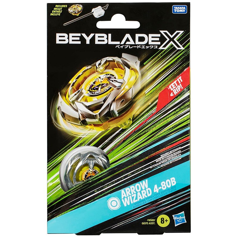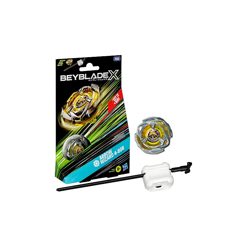 Include lansator Beyblade X proiectat de Takara Tomy și top cu piese metalice autentice turnate sub presiune: Arrow Wizard 4-80B Right-Spin Stamina Type.