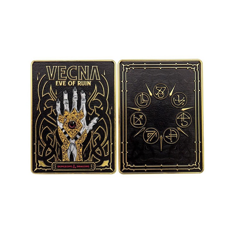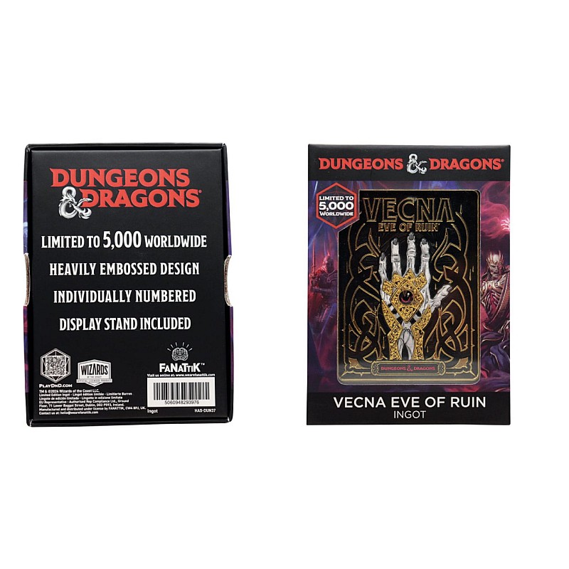 Cu mâna infamă a lui Vecna puternic reliefată pe fața sa, acest lingou metalic de colecție este finisat cu detalii din aur antic și email negru.