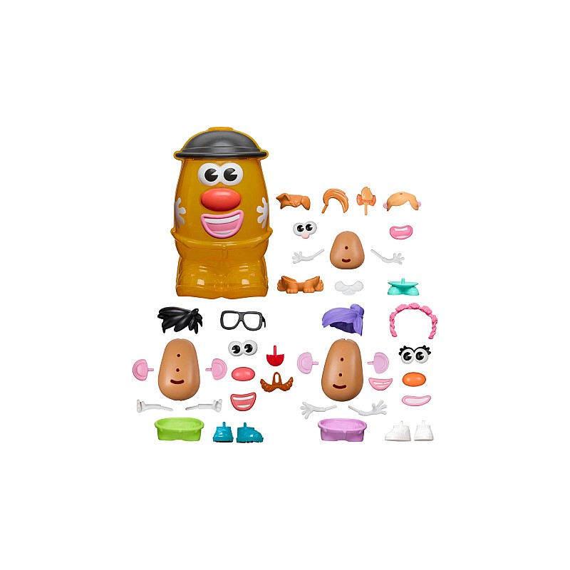 Acest set de jucării cu cartofi vine cu un recipient de depozitare în formă de cartof, 3 corpuri de cartofi și 38 de piese accesorii pentru capul de cartof, inclusiv urechi de animale, păr violet, coroană de flori și multe altele.