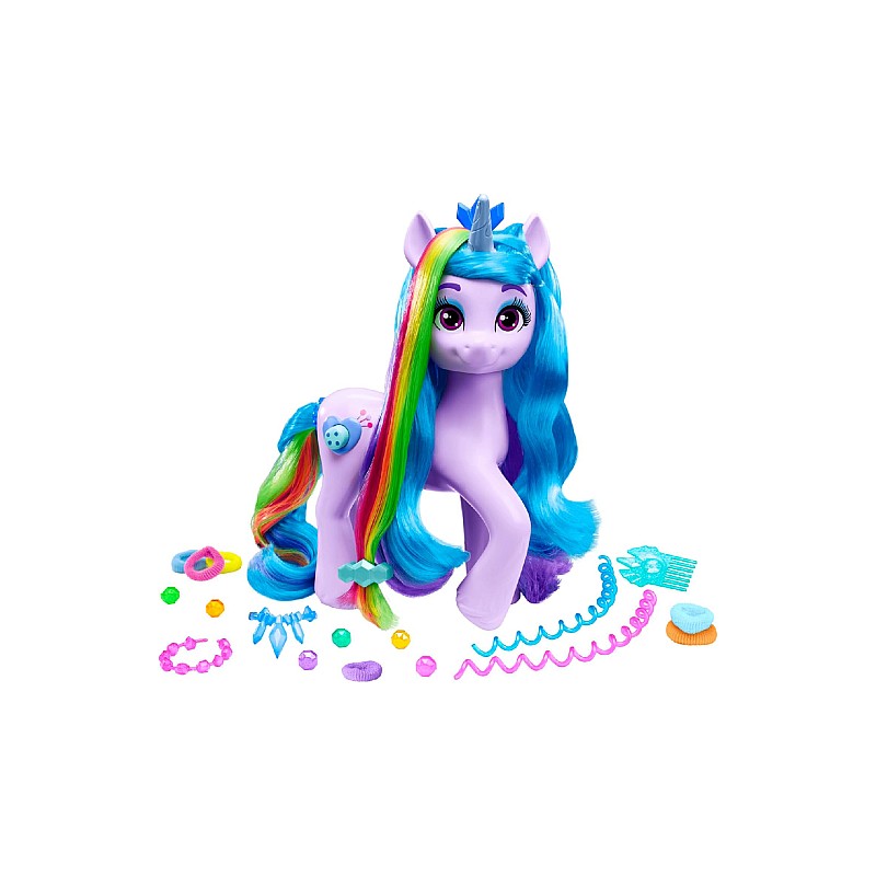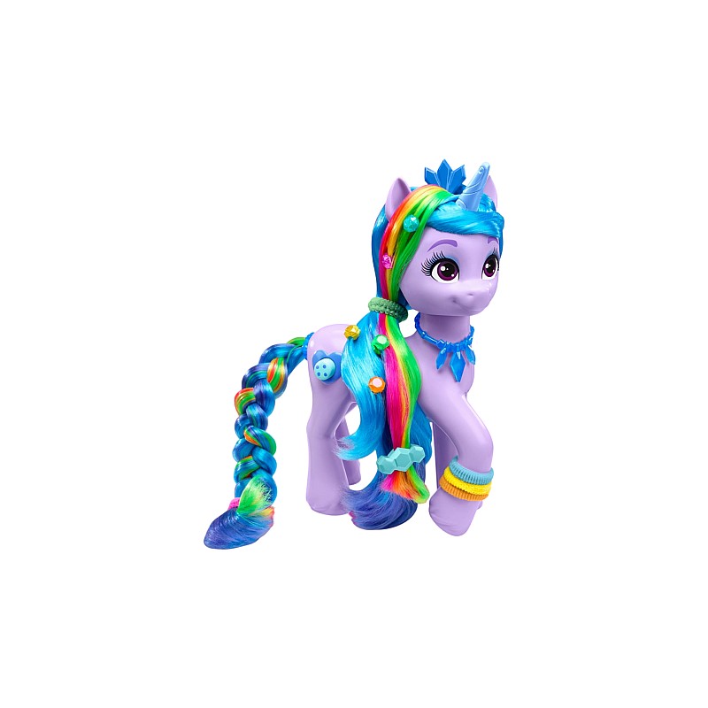 Figura Izzy are părul lung și moale în culoarea ei albastră caracteristică, cu o frumoasă dungă curcubeu în coamă și coadă.