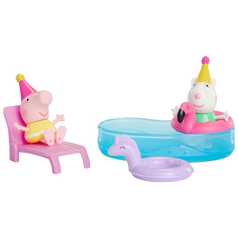Acest set de 6 piese Peppa Pig vine cu 2 personaje preferate Peppa Pig, Suzy Sheep și Peppa însăși, purtând costume de baie și pălării de petrecere.