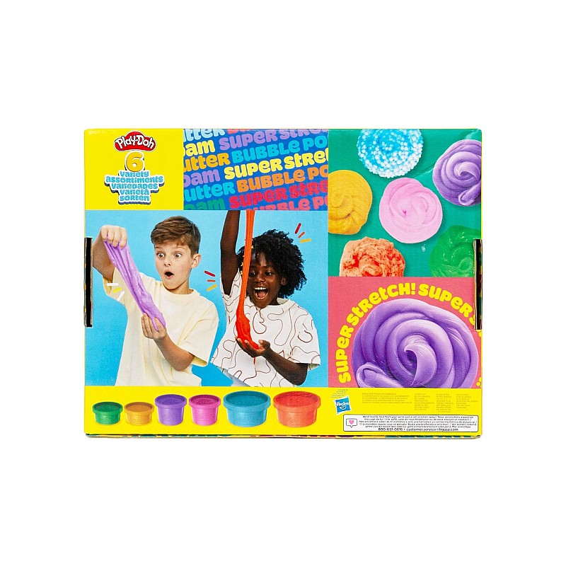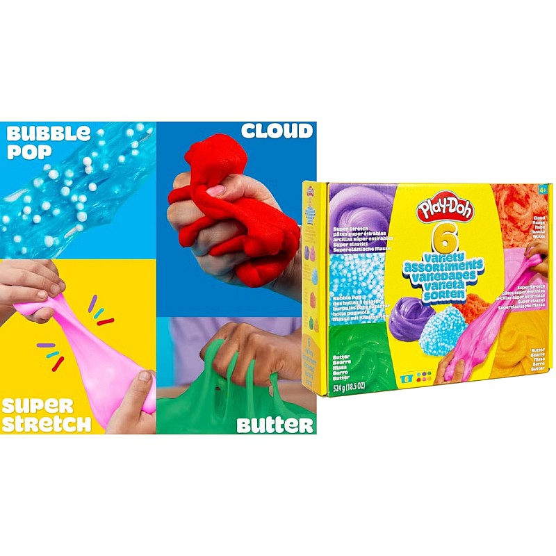 Cu șase recipiente diferite de Play-Doh, copiii se pot juca liber, pot modela forme imaginative și pot experimenta cu diferite texturi și culori.