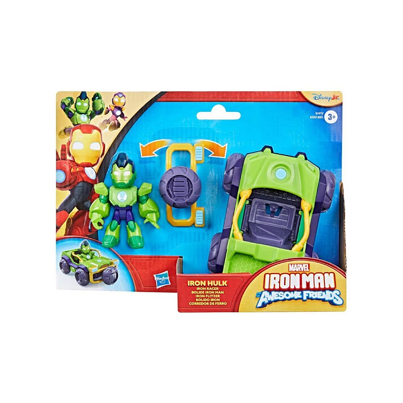 Alătură-te Echipei Iron Man în cele mai noi aventuri cu acest set de 2 figurine Iron Hulk și mașină Iron Racer!