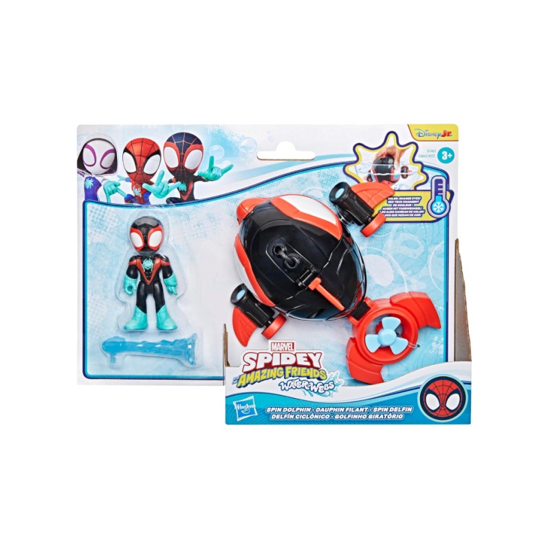 Imaginați-vă cum vă aruncați în acțiune și aventură cu vehiculul de jucărie Spidey și prietenii lui uimitori Water-Webs Spin Dolphin, așa cum apare în anumite episoade din Spidey și prietenii lui uimitori.