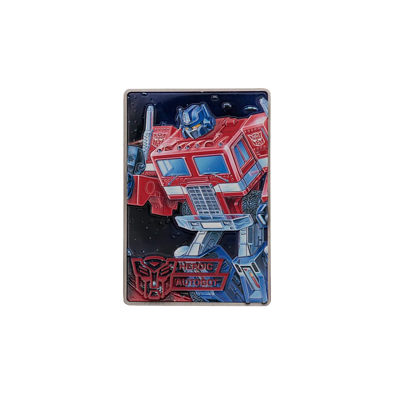 Lingoul îl prezintă pe liderul eroic al Autoboților, Optimus Prime, în smalț colorat puternic reliefat.