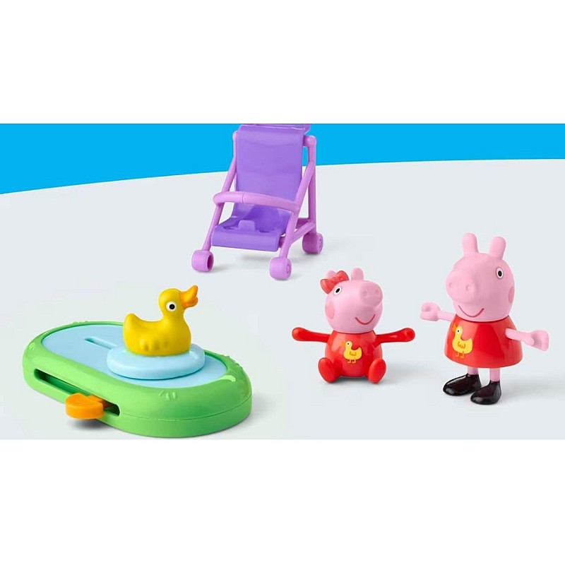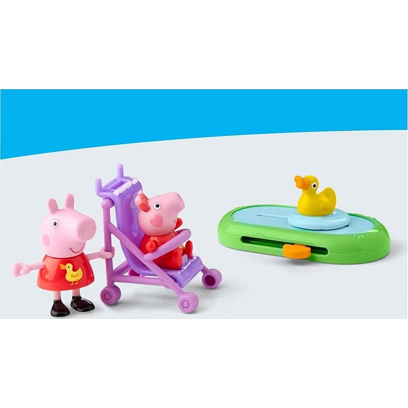 Evie stă în căruciorul ei, iar Peppa o împinge, iar rața din micul iaz se mișcă înainte și înapoi pentru și mai multă distracție.