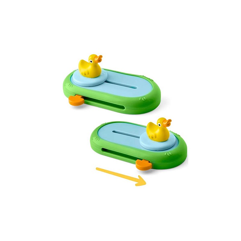 Ambele figurine poartă ținute galbene asortate cu motive de rațe, gata pentru joacă fără sfârșit.