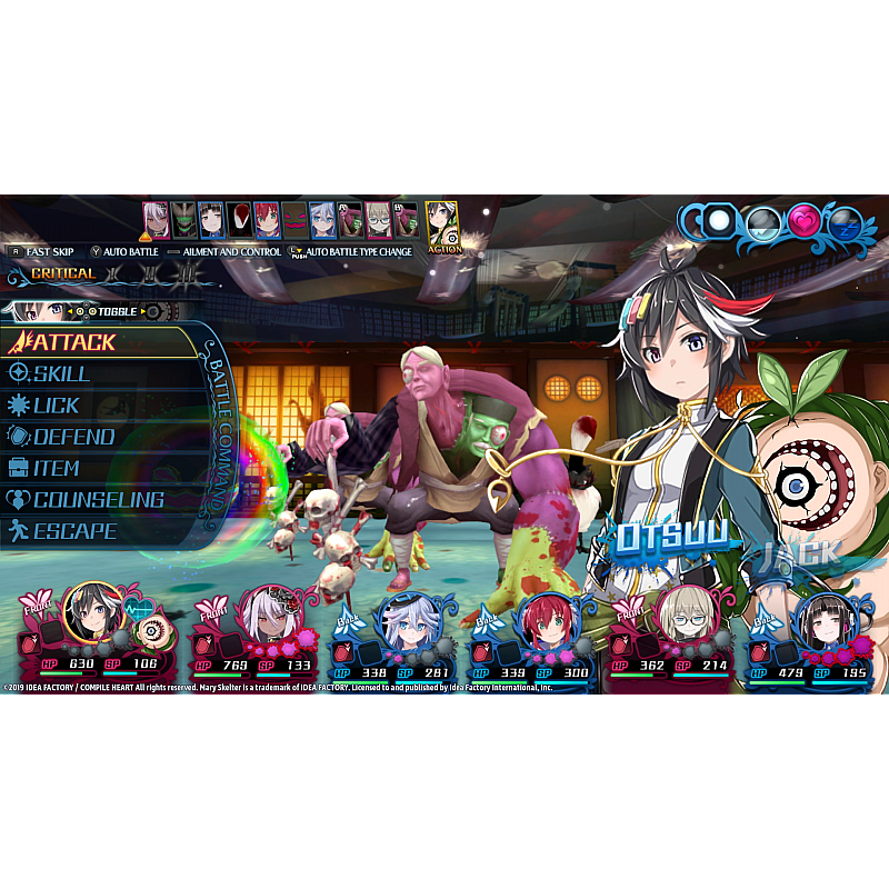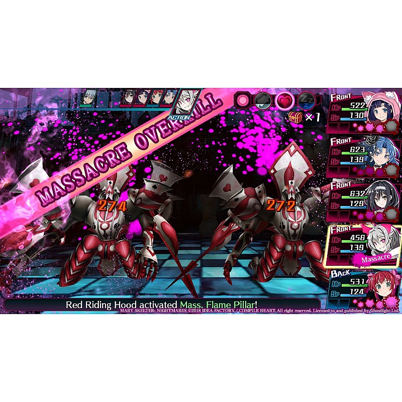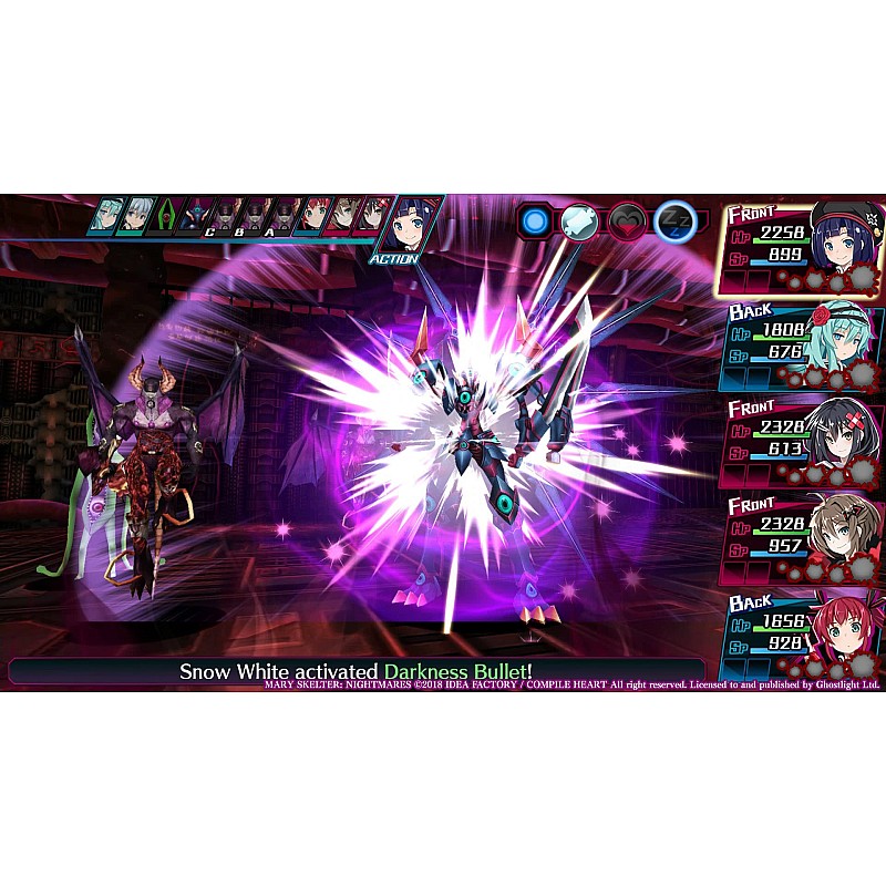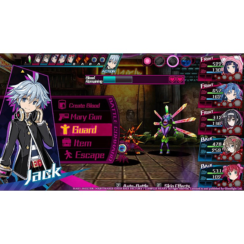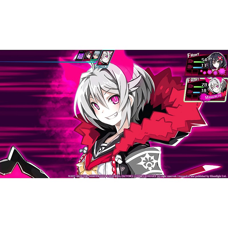 Vei lupta în bătălii pe rând și poți să-ți sporești aliații cu transformări de sânge. Dacă rezolvi misterele temnițelor și satisfaci dorințele închisorii, s-ar putea să scapi cu viață în Mary Skelter: Nightmares!