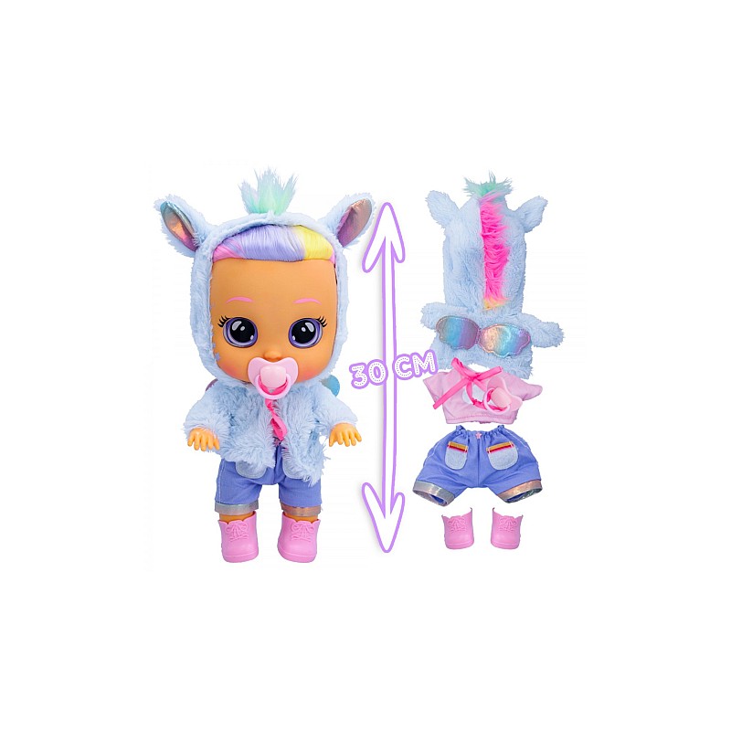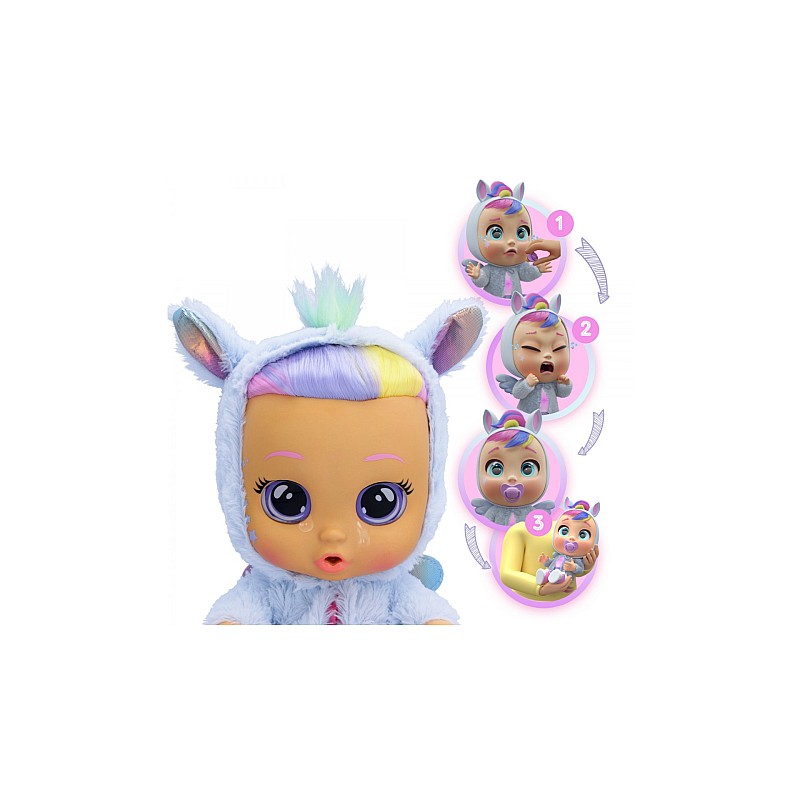 La fel ca toți bebelușii Cry Babies, plânge lacrimi reale de apă și scoate peste 10 sunete realiste de bebeluș atunci când îi scoți suzeta!