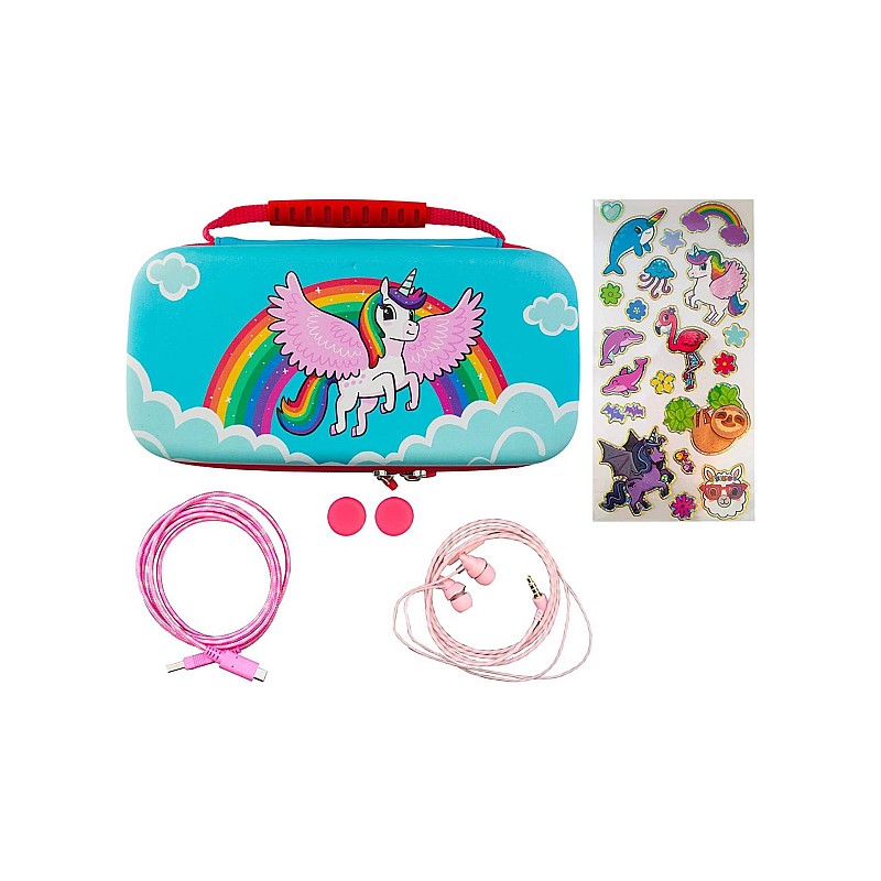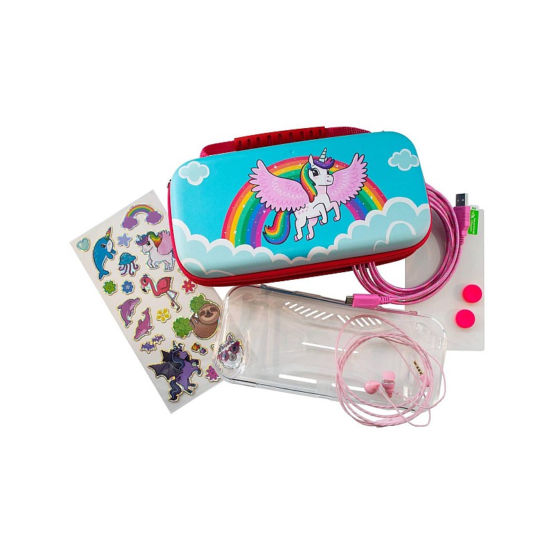 Toate articolele pot fi depozitate în interiorul husei de călătorie robuste, cu un design elegant Unicorn, precum și cu spațiu de depozitare suplimentar pentru până la 10 carduri de joc Nintendo Switch.