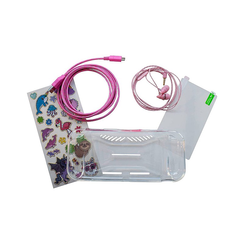 Include o husă de călătorie pentru consolă, o protecție TPU pentru mâner, un protector de ecran, mânere pentru degetul mare, un cablu de încărcare, căști și un kit de autocolante din 20 de piese.