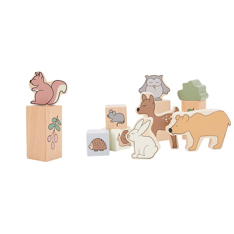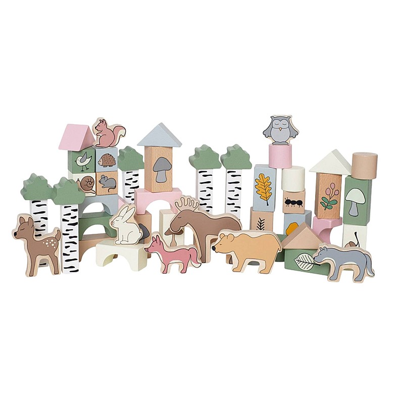 Acest set de 50 de piese din lemn prezintă blocuri de diferite forme, dimensiuni și culori, cu o temă prietenoasă de pădure.