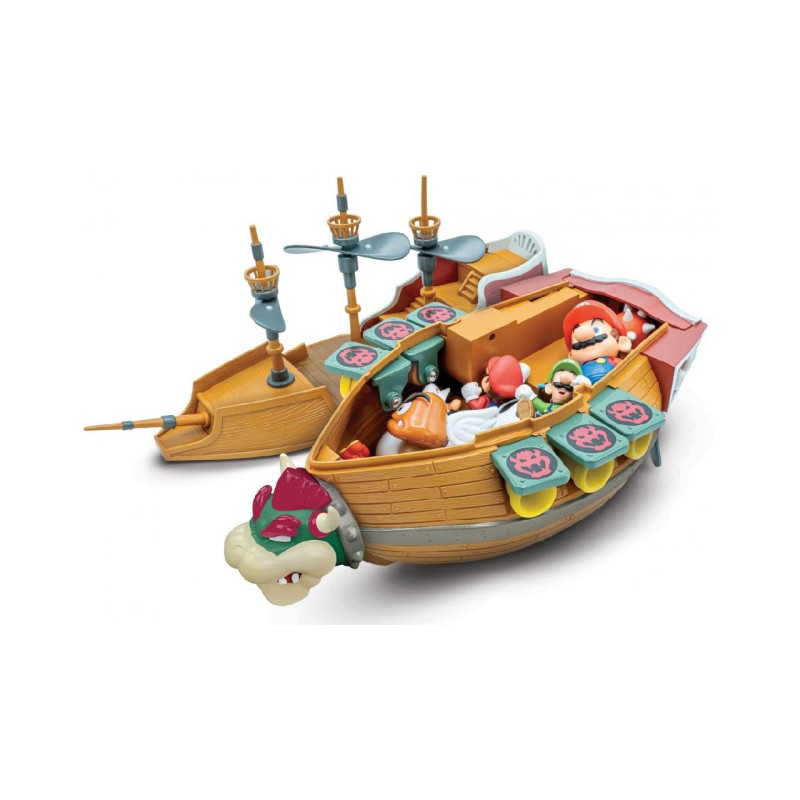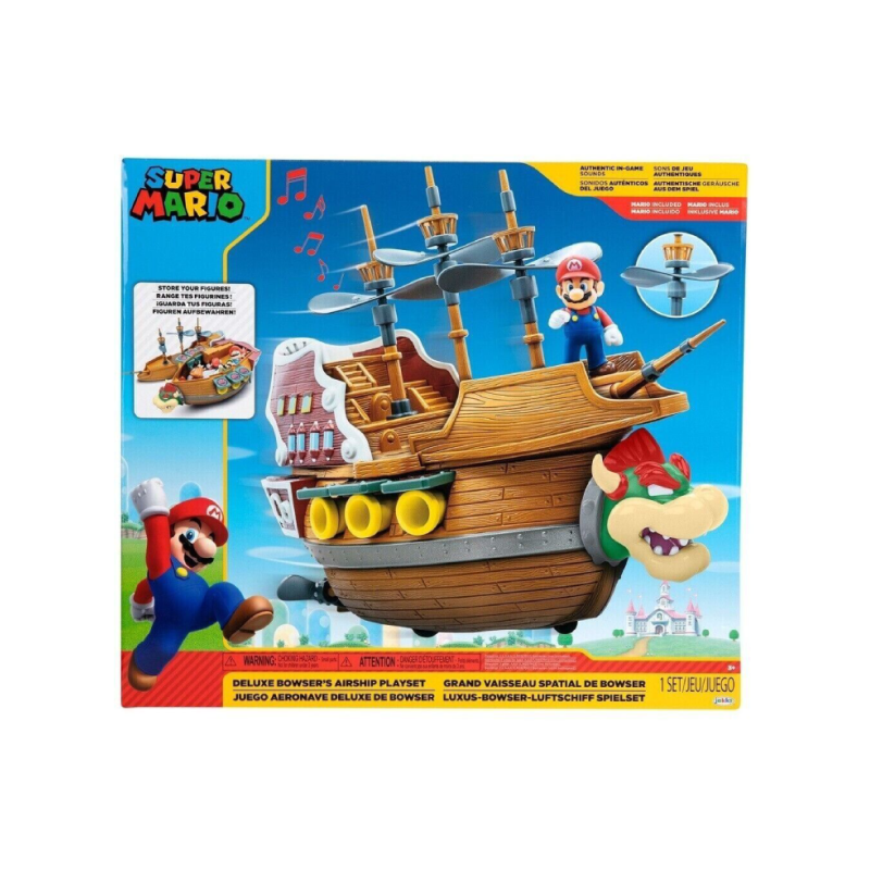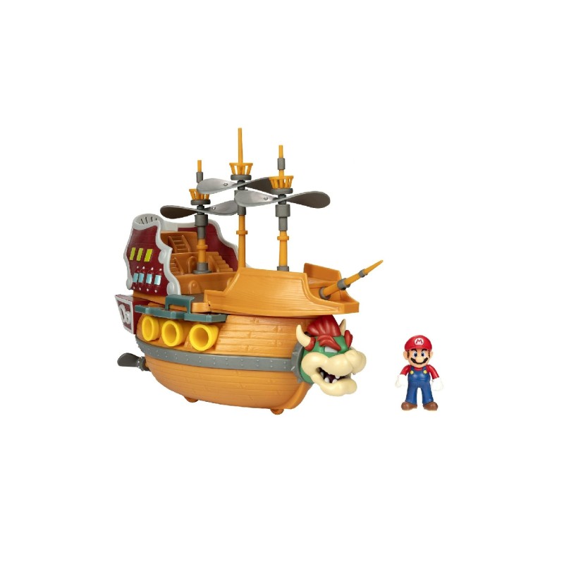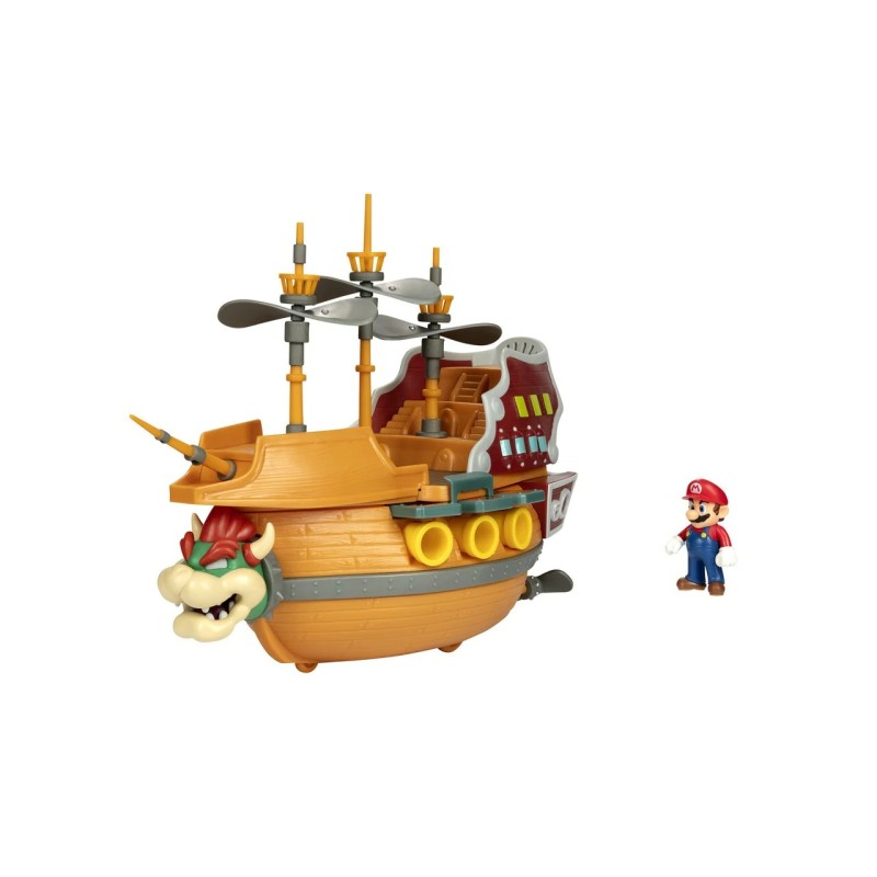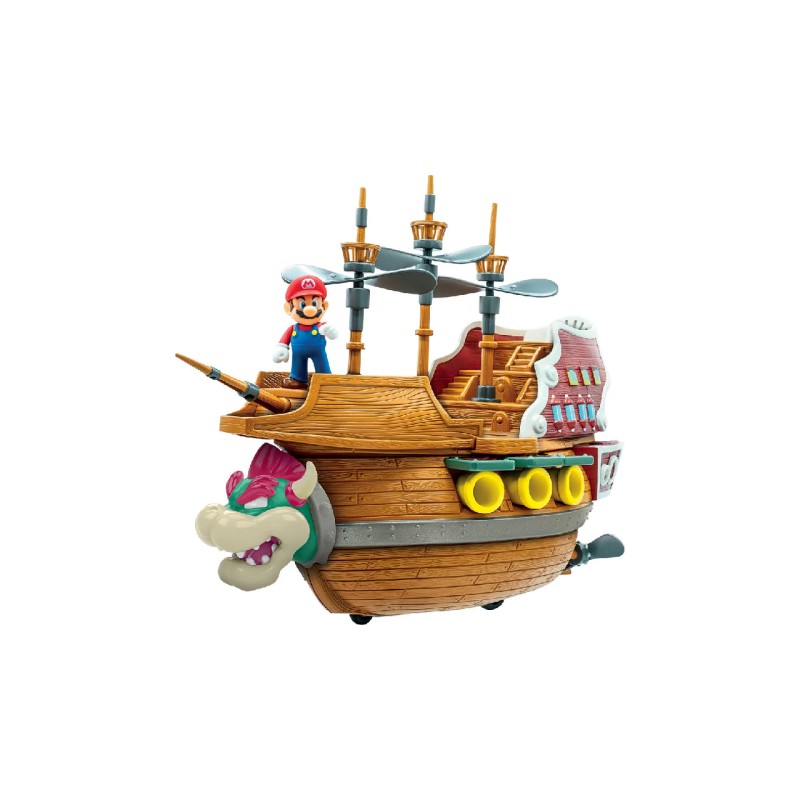 Echipat cu tunuri, catarge cu elice rotative, roți și sunete autentice din joc, dirijabilul include o figurină Mario de 3,5 cm și jumătate pregătită pentru victorie.