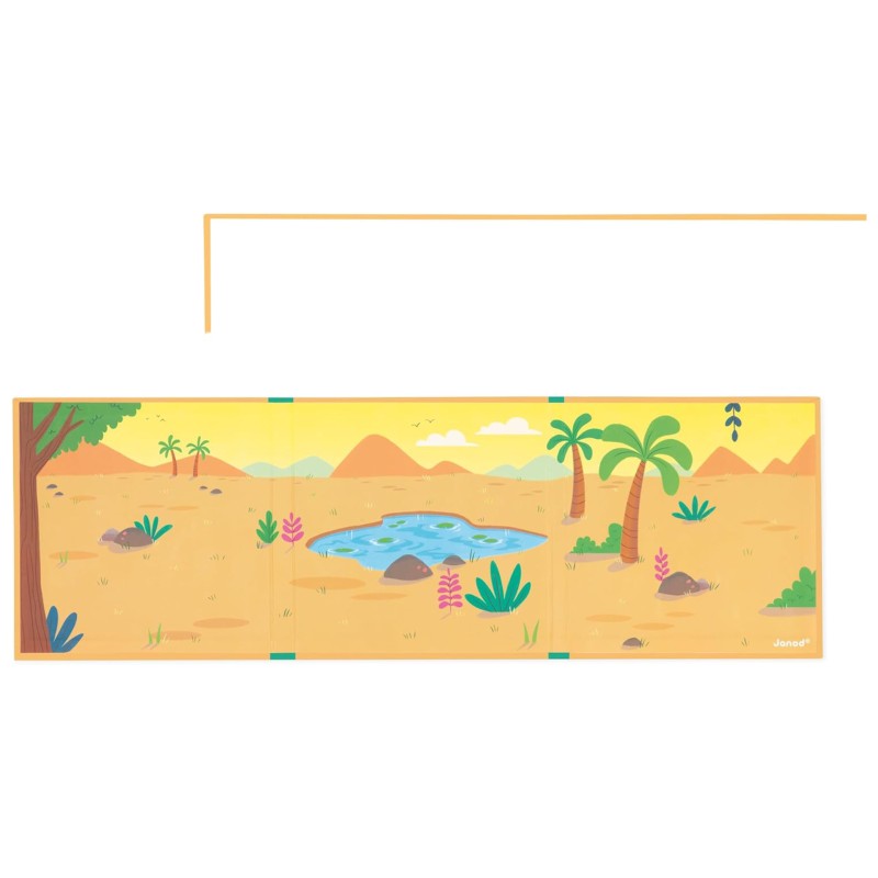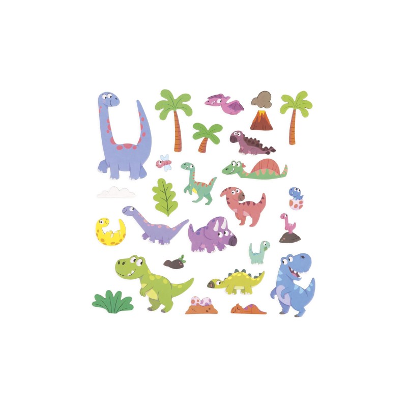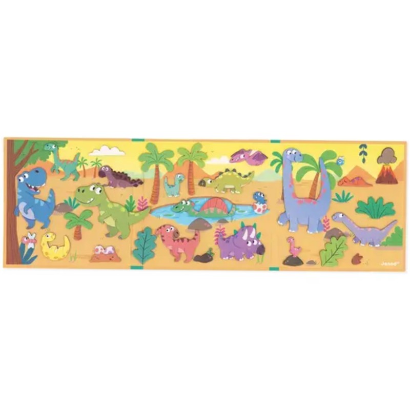 Acest joc magnetic constă dintr-un fundal ilustrat și 30 de magneți cu tema dinozaurilor.