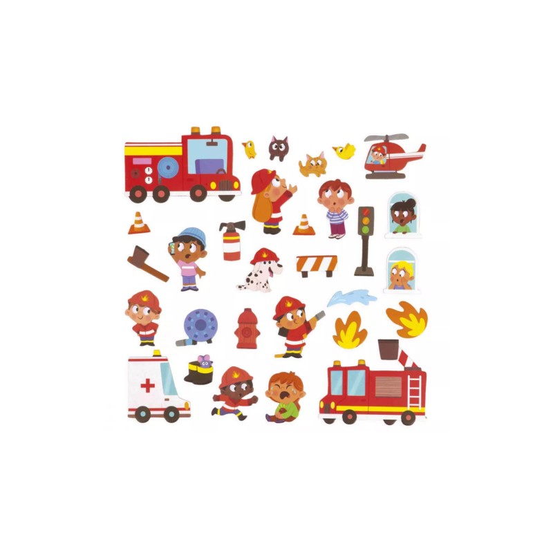 Acest joc magnetic constă dintr-o tablă de fundal colorată cu ilustrații tipice pompierilor, în plus față de 30 de magneți repoziționabili.