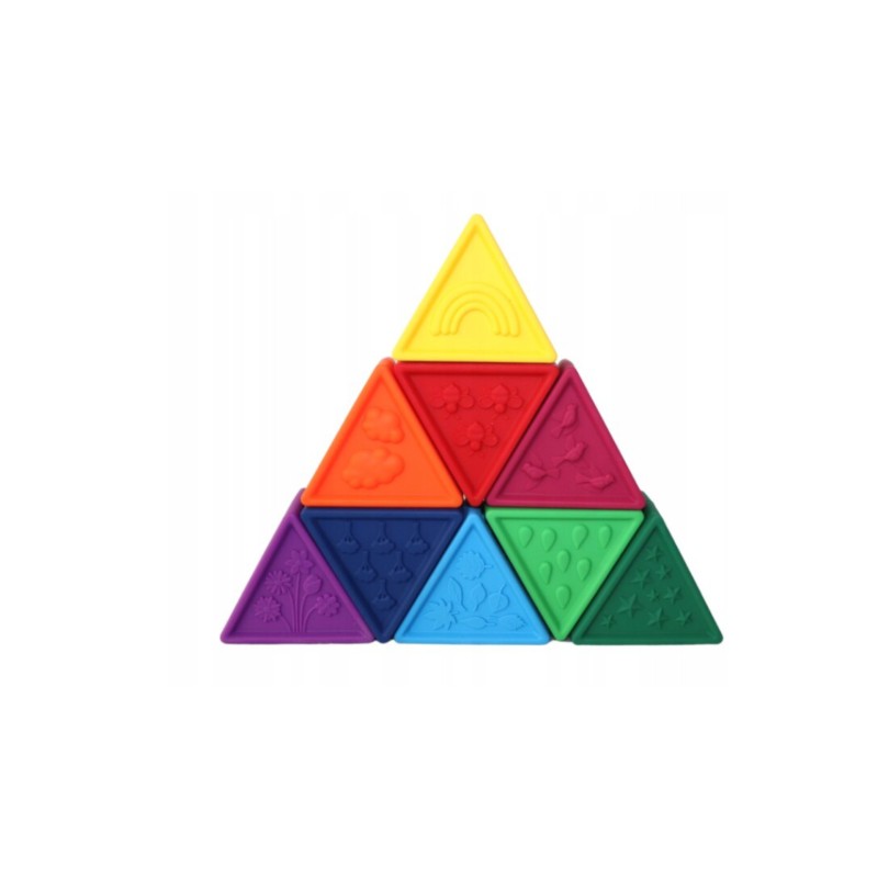 Setul conține blocuri în formă de triunghi colorate, care pot fi stivuite, înlănțuite și conectate în diferite moduri, încurajând jocul creativ și explorarea.