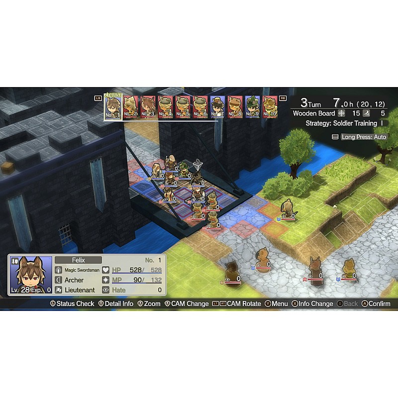 Implică-te în bătălii pe rând pe o scenă 3D cu vedere în sferturi, utilizând strategic terenul și orientarea personajelor.