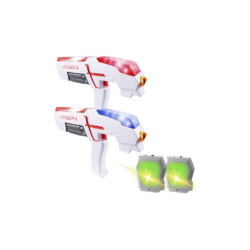- Două pistoale cu lumini laser care activează țintele din piept atunci când lumina atinge senzorii de lumină. Siguranță pentru copii.